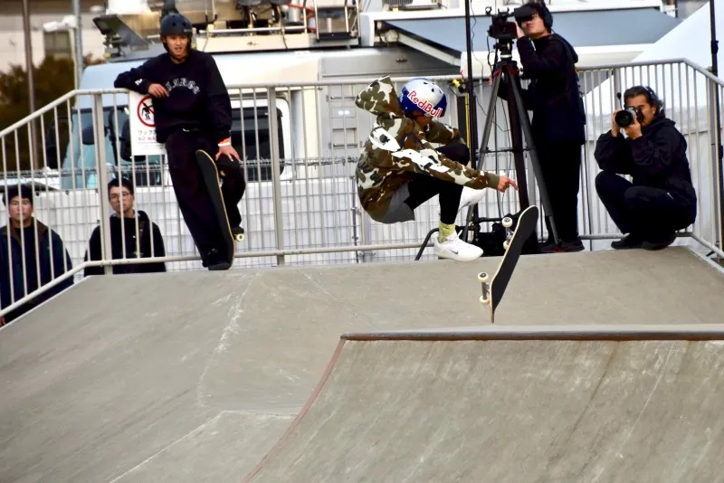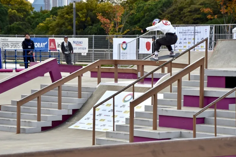 将軍レール以外全てのトリックが回し技、そして驚愕なのが3本ともノーミス(3本合わせて135秒間、超高難度のトリックを24回)という驚異の滑りを見せ、佐々木音憧に次ぐ2位でベストトリックに進む。