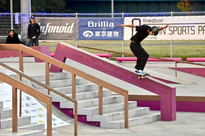 ラン2本目ではラストトリックの、将軍レールでのバックサイド50-50グラインドを時間内に収め、83.66点を獲得。