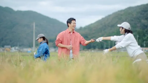 そして場面は、黄金色の稲穂が揺れる豊岡市の田んぼへと移り変わります。工藤阿須加さんは実際に現地を訪問し、地元農家や子どもたちとともに、コウノトリ育む農法で育てたお米の収穫に汗を流します。現地のお米を使ったおにぎりをみんなで食べたり、地元農家の人たちと語り合ったりする中で、農業を応援する輪が着実に広がっていることを実感した工藤阿須加さんは、カメラに向かって 「一緒にやろうよ!」 と力強く呼びかけます。